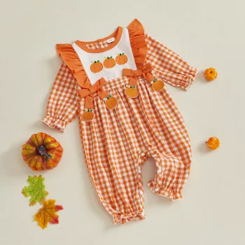 Baby Girls Plaid Romper with Pumpkin and Turkey Embroidery
